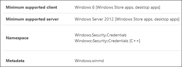 When looking at MSDN help for a Windows 8 API class, such as PasswordVault, it is indicated that this class can be used from a Windows Store application or a Desktop application (Console, WinForms or WPF):