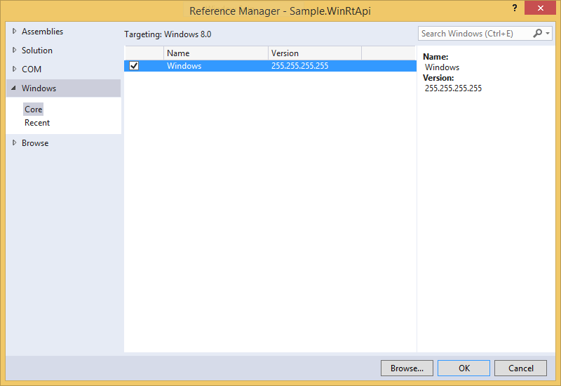 Edit the csproj file and add <TargetPlatformVersion>8.0</TargetPlatformVersion>