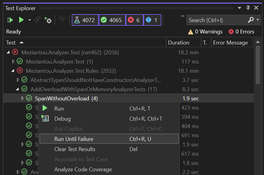 If you need to reproduce locally a flaky test, you can use Visual Studio or Rider to run the tests until it fails. This way, you can debug the test and understand why it fails.