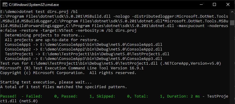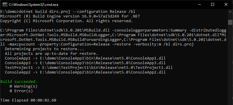 Finally, you can use the dotnet CLI to build, test, and pack the project. The SDK will forward the command to all referenced projects: