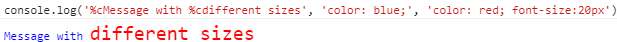 console.log('%cMessage with %cdifferent sizes', 'color: blue;', 'color: red; font-size:20px');