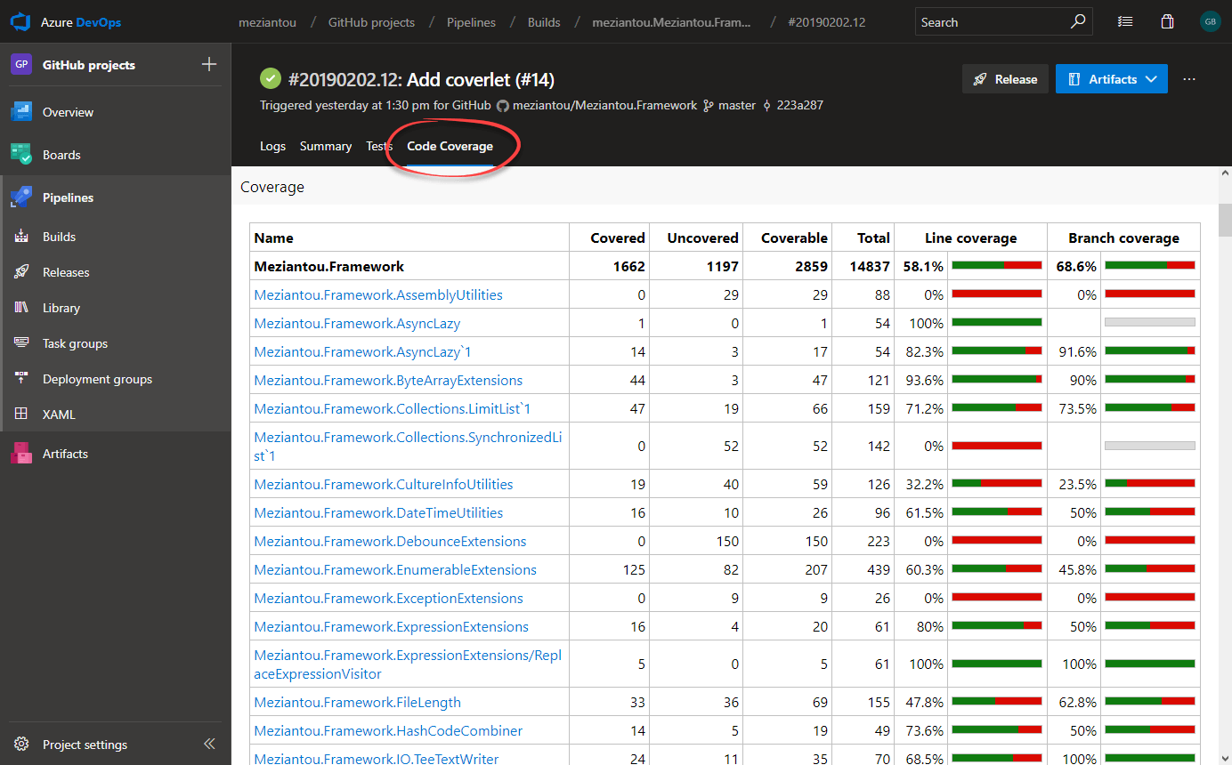 You now have a website that conveniently displays the code coverage. Note that there are multiple output formats. Here I use HtmlInline_AzurePipelines because at the end we would like to view this web site directly in Azure Pipelines, so it seems to be the best output for that.