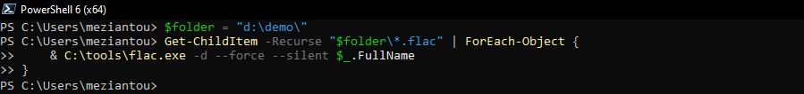 & C:\tools\flac.exe -d --force --silent $_.FullName