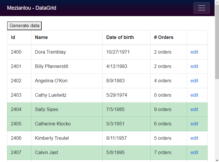 <Grid Items="customers" class="table table-bordered" RowClass='(row, index) => row.OrdersCount > 5 ? "table-success" : ""'>