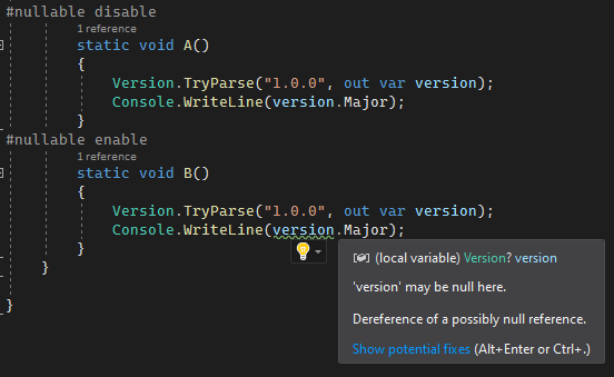 _ = version.Major; // ok, version is not null as TryParse returns true