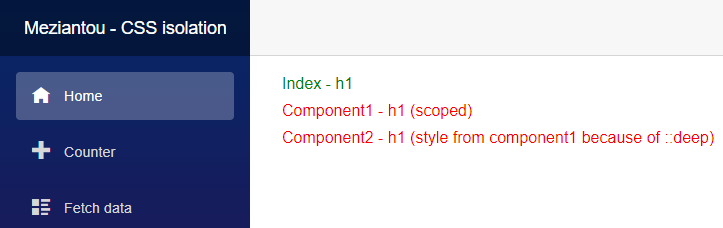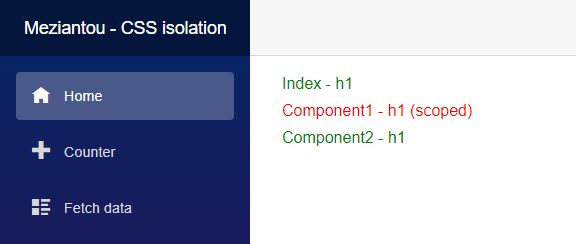 You can see that the h1 element of the first component is red because of CSS isolation. Other h1s use the global CSS.