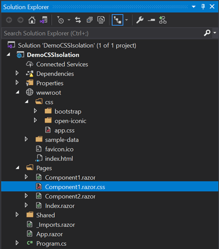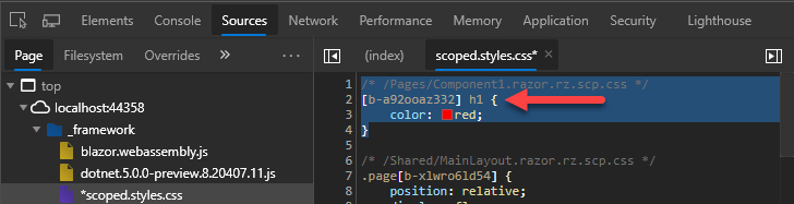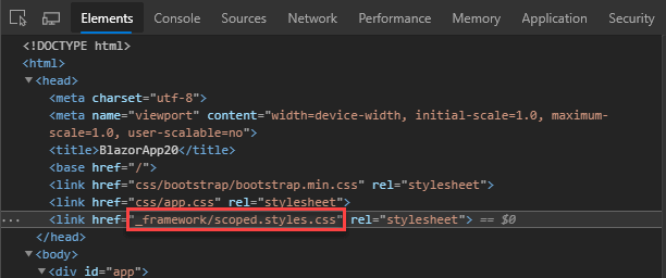 When you use CSS isolation, Blazor generates a new CSS file named _framework/scoped.styles.css that contains the style of all scoped CSS files.