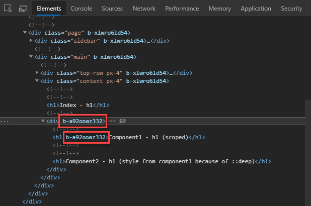 <h1 b-a92ooaz332>Not styled by scoped CSS with ::deep</h1> <!-- [b-a92ooaz332] h1 doesn't match this element -->