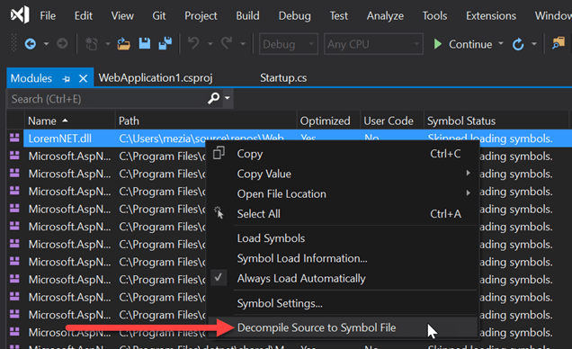 Starting with Visual Studio 2019 16.5, you can generate a PDB and the source files by decompiling the assembly. Visual Studio relies on ILSpy for decompiling the DLLs. Decompiling code comes with limitations. For instance, you cannot get the original comments nor variable names. Also, some code may be more complicated to read than in the original code because the decompiler doesn't recognize some patterns. Also, DLLs may be obfuscated, making them harder to decompile.