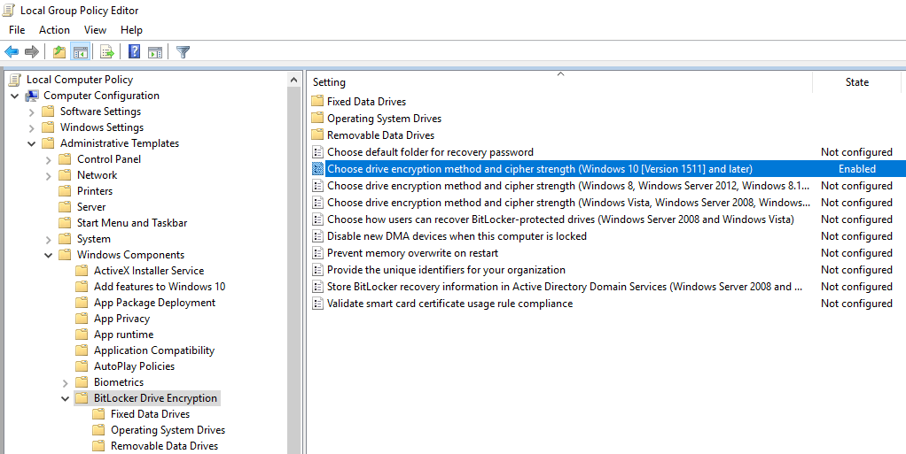 Choose drive encryption method and cipher strength (Windows 10 [Version 1511] and later) - Select