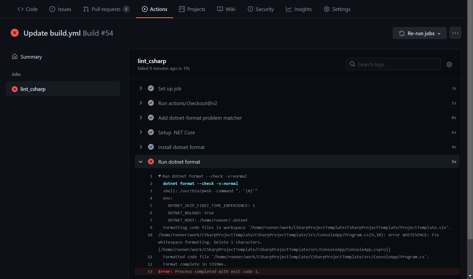 dotnet format returns a non-zero value when the code doesn't respect the coding style