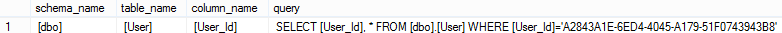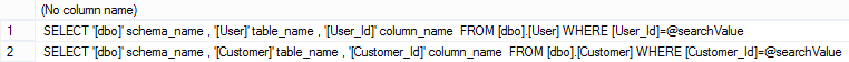 SELECT '[dbo].[Customer].[Customer_Id]' FROM [dbo].[Customer] WHERE [Customer_Id] = @searchValue