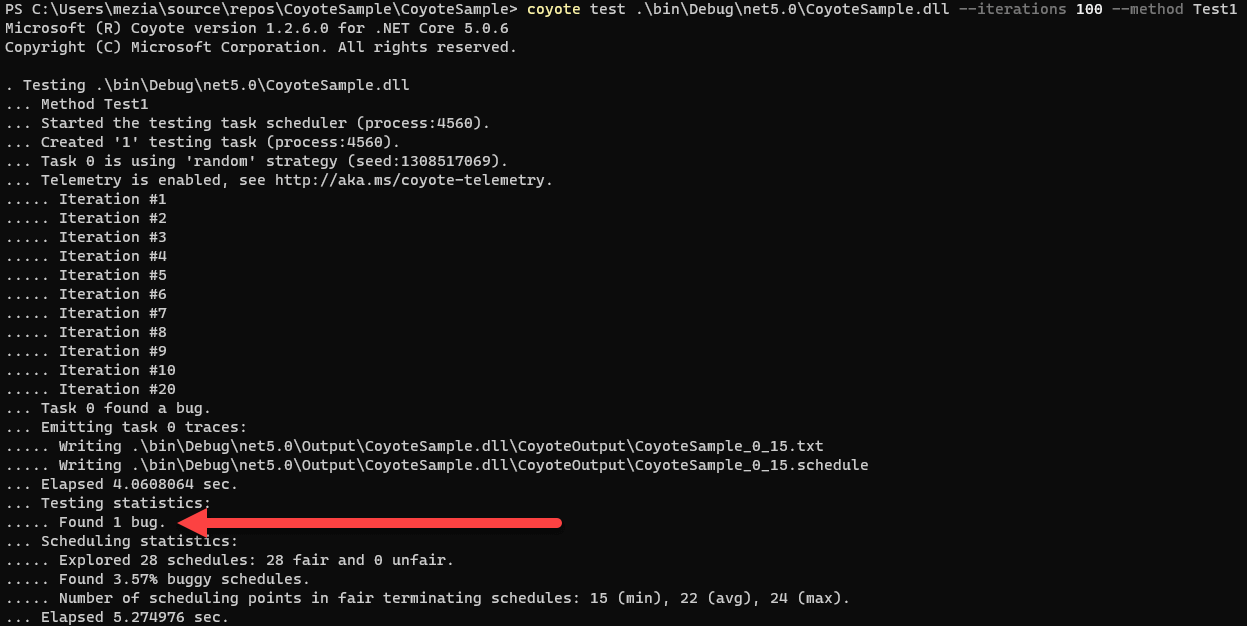 coyote test bin/Debug/net5.0/CoyoteSample.dll --method MyFirstCoyoteTest --iterations 100