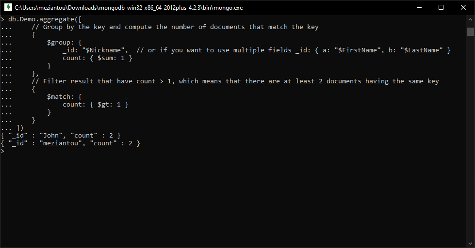_id: "$Nickname", // or if you want to use multiple fields _id: { a: "$FirstName", b: "$LastName" }