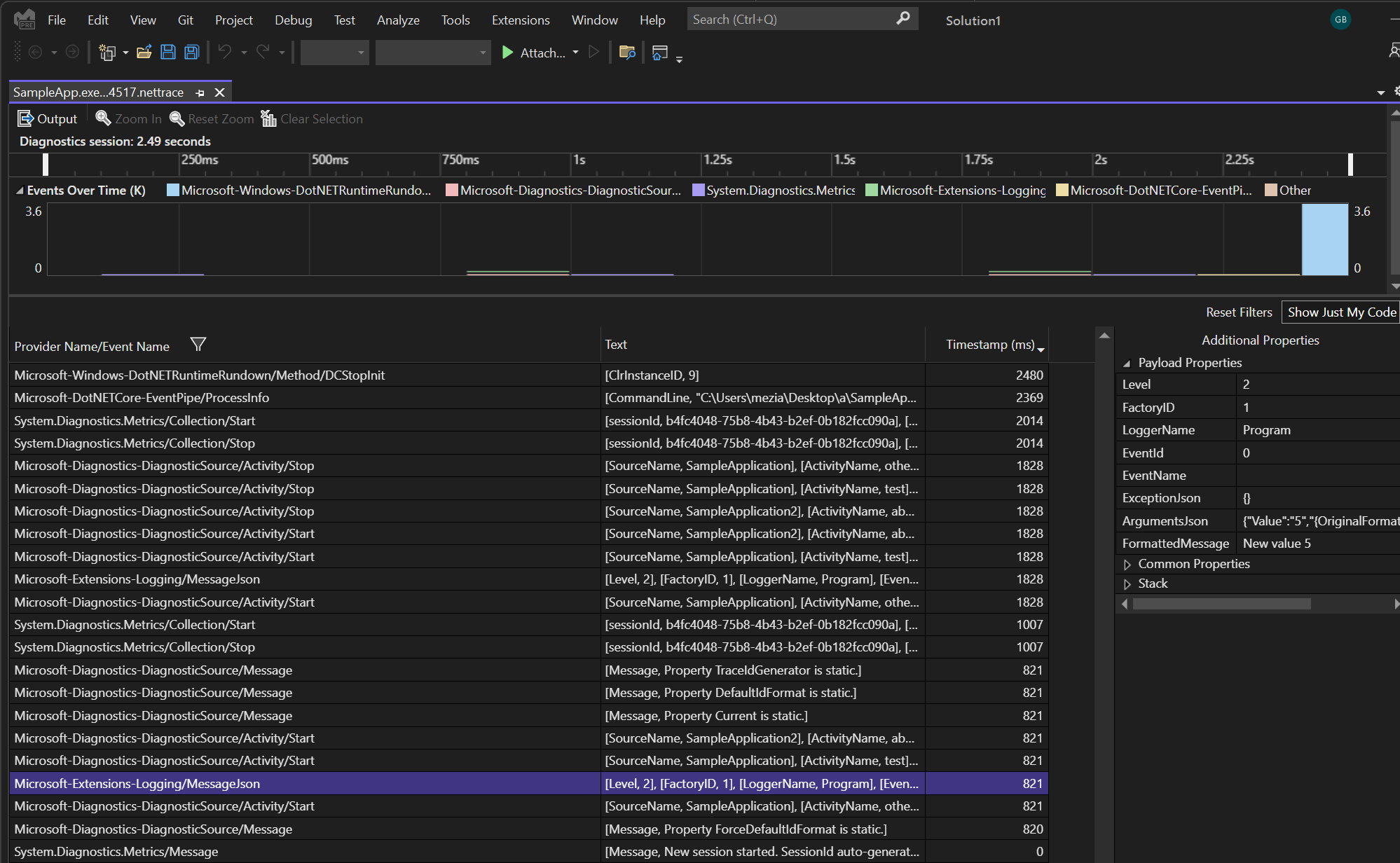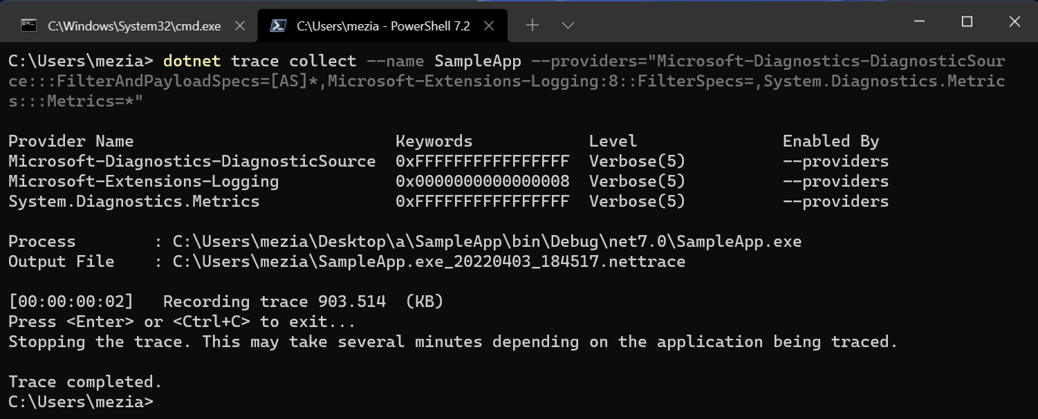 dotnet trace collect --name SampleApp --providers="Microsoft-Diagnostics-DiagnosticSource:::FilterAndPayloadSpecs=[AS]*,Microsoft-Extensions-Logging:8::FilterSpecs=,System.Diagnostics.Metrics:::Metrics=SampleMeter"