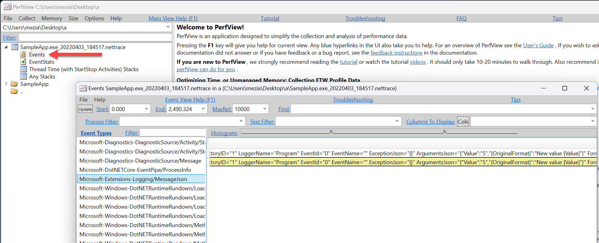dotnet trace collect --name SampleApp --providers="Microsoft-Extensions-Logging:2::FilterSpecs="