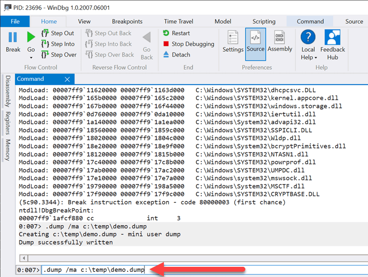 If you are debugging an application using WinDbg, you can use the .dump command to generate a dump file. The /ma option allows generating a minidump for all attached processes.