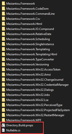 If you have multiple projects such as in my GitHub project Meziantou.Framework, you don't want to copy this file in every project. Instead, I choose to inject it using the Directory.Build.props file. Here's the file structure: