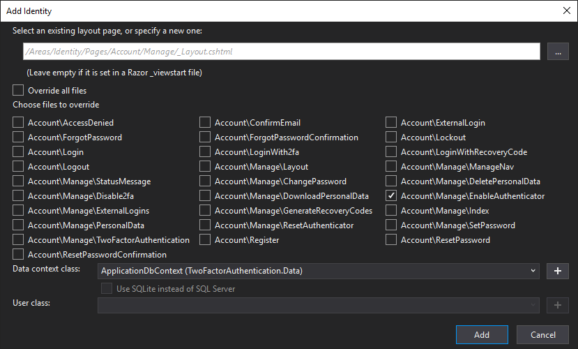 Select the pages you want to add to your project. In our case, the Account\Manage\EnableAuthenticator