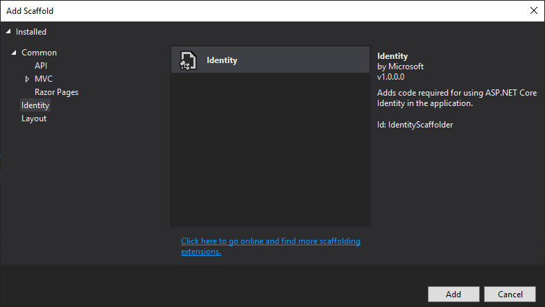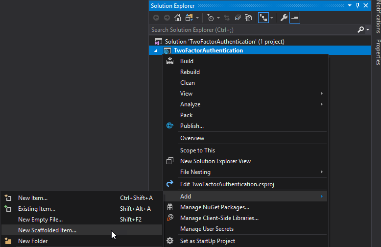 By default, the authentication pages are not generated in the project. There are loaded from a NuGet package. This allows you to override only the pages you need in your project. This is very convenient because there are many pages and it's hard to update them when the template is updated. In our case, we need to update one page to display a QR code you can scan from your cell phone. You can do it using the command line, or using Visual Studio. In this post, I'll use Visual Studio.