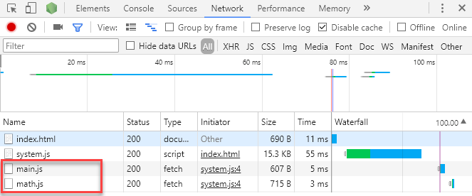 And in the network tab, you should see the main.js and math.js are downloaded while they are not directly included in the page. The dependencies are downloaded automatically by SystemJS, so you don't need to manage them anymore: