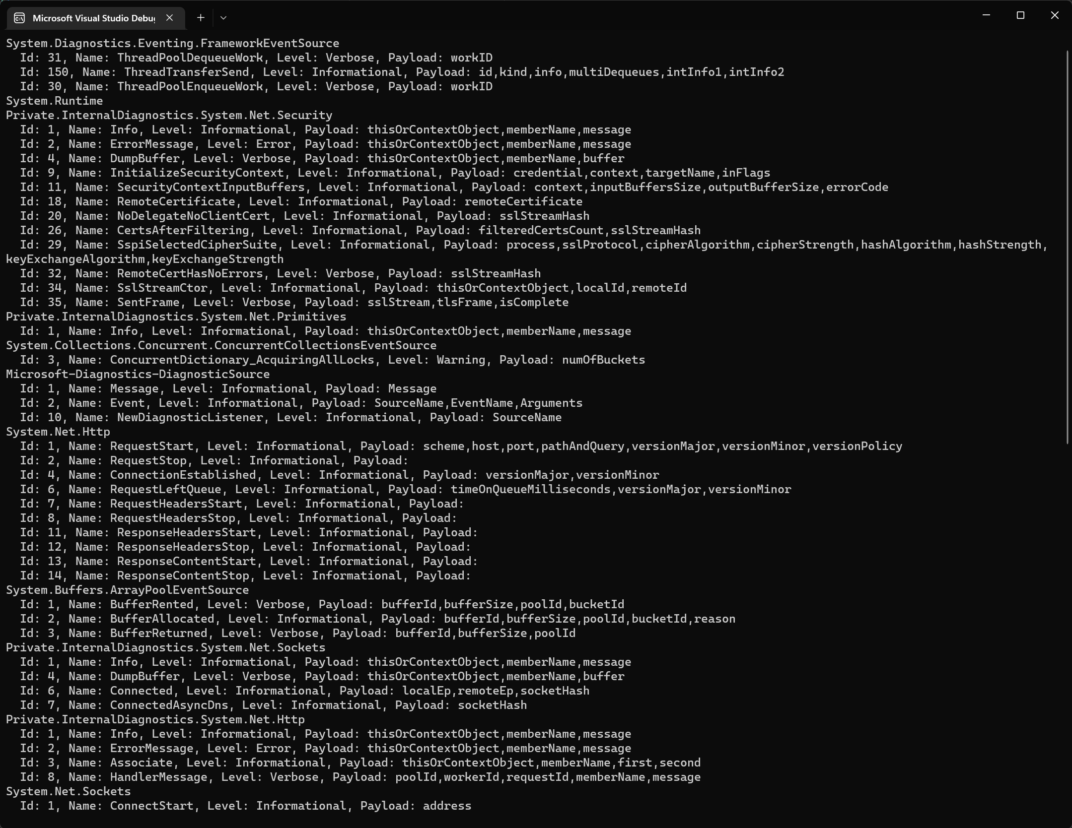 When tracing an application, it can be useful to know which ETW events are available. .NET exposes many events to trace an application as shown in some previous posts (Getting telemetry data from inside or outside a .NET application, or Avoid DNS issues with HttpClient in .NET). It's hard to know which events are available and which ones are sent by the application. In this post, I describe how to list all available events in a .NET application by registering a custom EventListener.