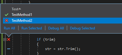Now, let's add a test that fails. A red check is added in front of the lines of code. This indicator override other indicators. By clicking on a red cross, you can see the details of each test that covers the selected line.