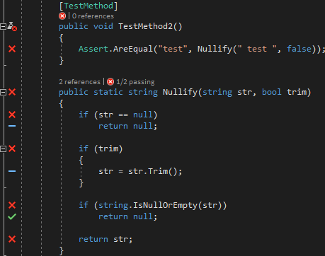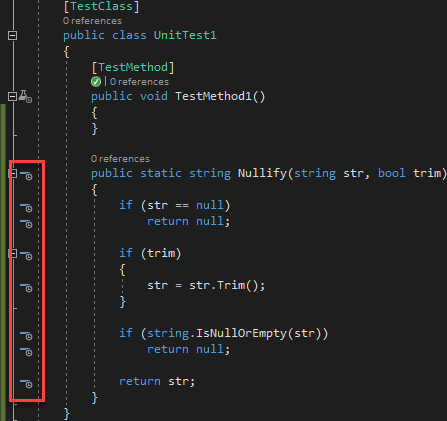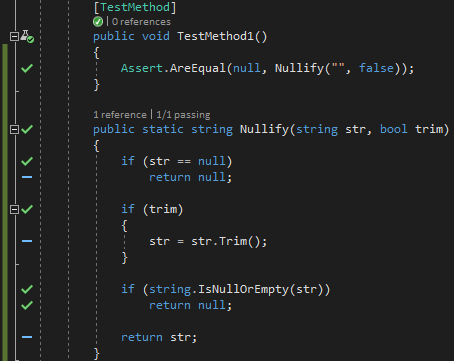 After enabling live unit testing, Visual Studio adds a blue dash in front of each line of code of the method. This means the statement is not tested.