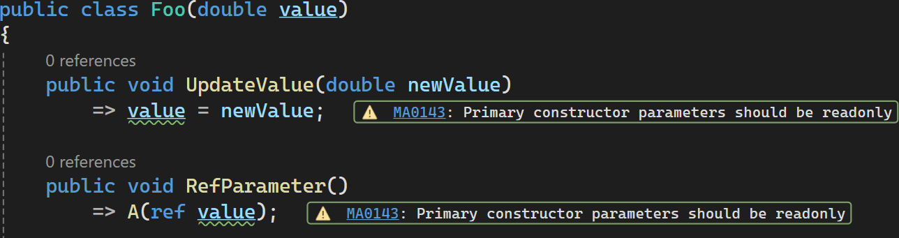 Once the package is installed, the rule MA0143 reports all assignments to the primary constructor parameters in your project or usages as ref or out parameters. For instance, the following code will report an error: