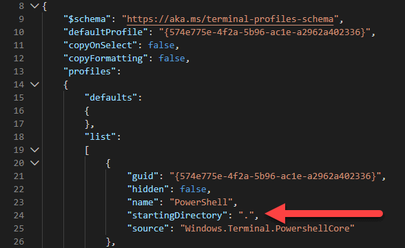 Add "startingDirectory": "." to the profile to set the starting directory to the current directory