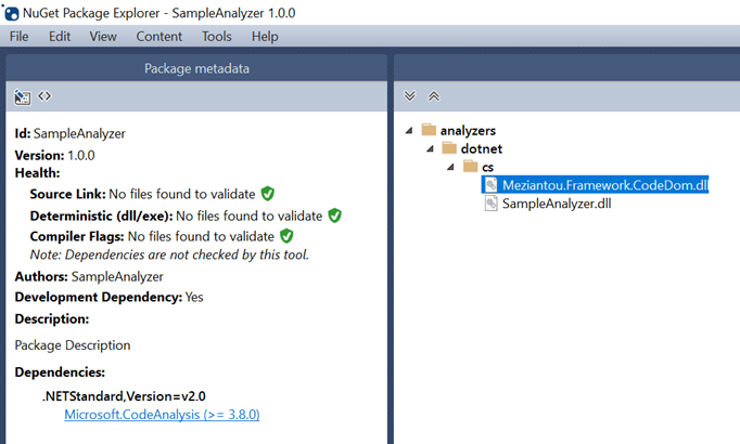 Your package should now include all the DLLs, so Roslyn can load them! Note that if multiple analyzers reference the same package at different versions, you may have errors at runtime. One solution would be to use ILRepack to merge assemblies and remove the dependency.