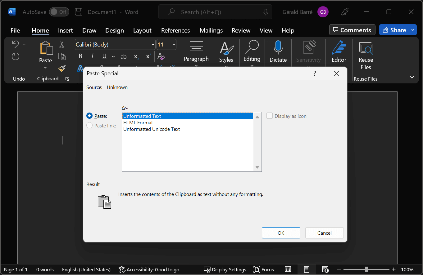 Microsoft Office (method 1): Ctrl + Alt + V, then select "Unformatted text"