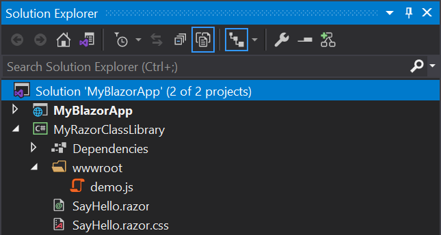 For the component I'll reuse the component from my previous post about JS isolation. Let's start with the JS file. You can create a new JS file named wwwroot/demo.js. The files under the wwwroot folder are automatically embedded in the DLL when compiling and are accessible using the URL _content/<ProjectName>/<FileName>.