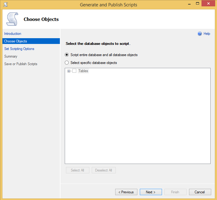 It is possible to filter the elements to be generated. If you want to export data from one or more tables, just check the desired tables: