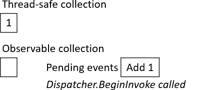 Eventually the dispatcher will process the pending items and do the change to the observable collection ⇒ Both collections contain the same data and the UI should be updated