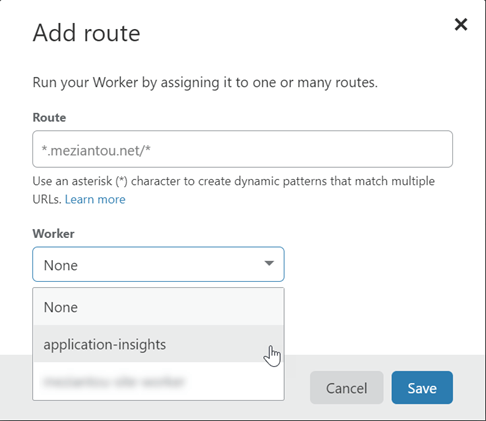 Last, you need to associate the worker on your website. Go to the Workers page, and click on the "Add route" button. Enter the route