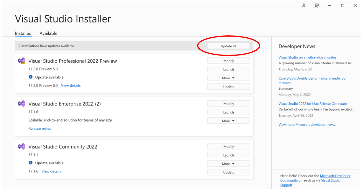 When you have multiple Visual Studio instances, the Visual Studio Installer allows you to update them one by one. This is not very convenient as the installer takes time to download and install newer versions. Daniel Cazzulino made a .NET tool to manage Visual Studio instances. This tool allows you to quickly update all Visual Studio instances on your machine: