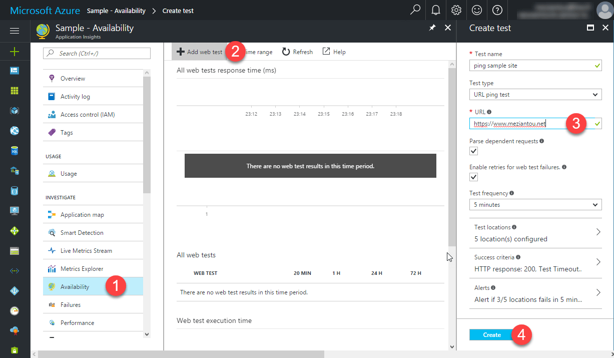 This is where Application Insights takes action. Indeed, one of the functionalities of Application Insights is to test the availability of a website. Great news, this is free and you'll get a nice report of the up-time of your website!