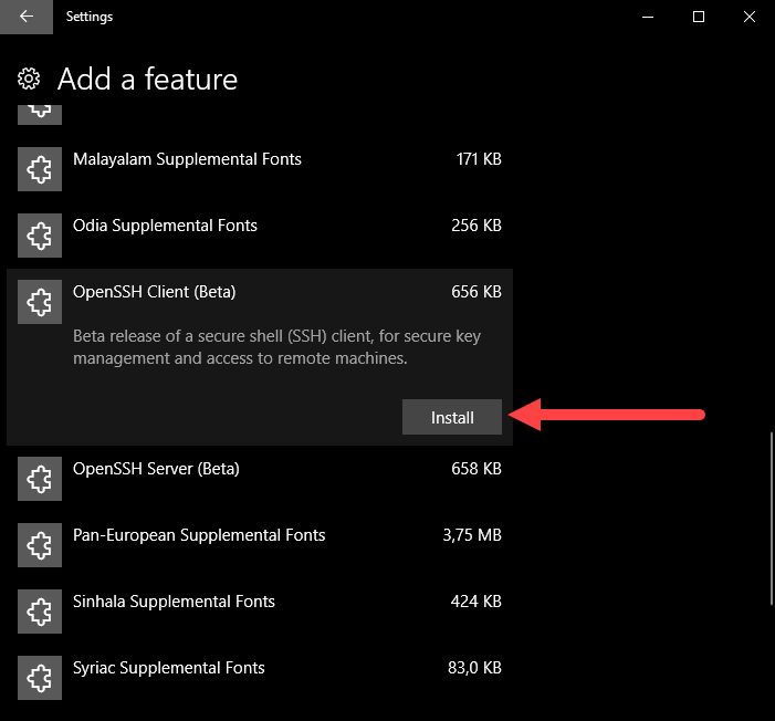 Select "OpenSSH Client (beta)" and click "Install"