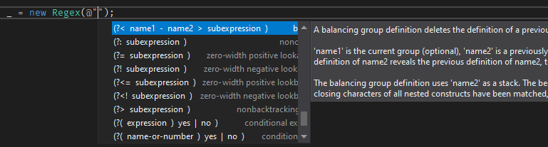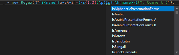 IntelliSense helps you to write the regex pattern. It's helpful to discover the syntax or to autocomplete character categories: