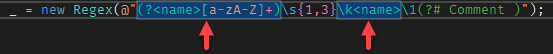 When you see a backreference in the pattern, it is not easy to find the referenced group, especially for numbered backreferences. To quickly identify the referenced group, Visual Studio highlights it when your cursor is on a backreference: